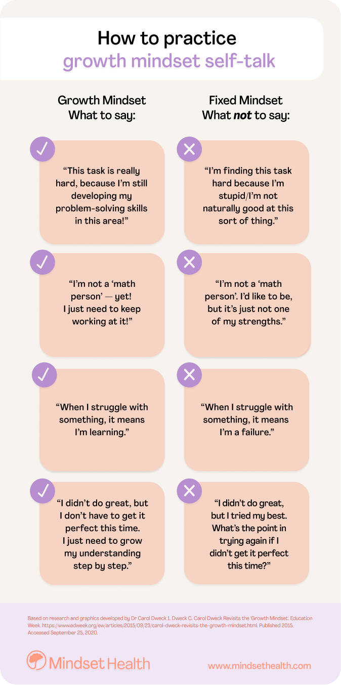 A growth mindset means you believe your intelligence and talents can be developed over time. A fixed mindset means you believe intelligence is fixed – so if you’re not good at something, you might assume you’ll never be good at it.
